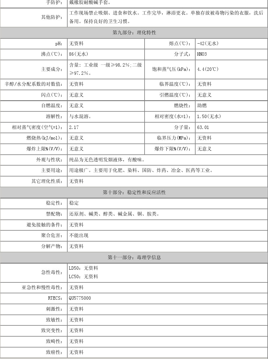 【物理性質(zhì)】純硝酸為無色透明液體,濃硝酸為淡黃色液體(溶有二氧化氮),正常情況下為無色透明液體。有窒息性刺激氣味。濃硝酸含量為68%左右,易揮發(fā),在空氣中產(chǎn)生白霧,是硝酸蒸汽與水蒸汽結(jié)合而形成的硝酸小液滴