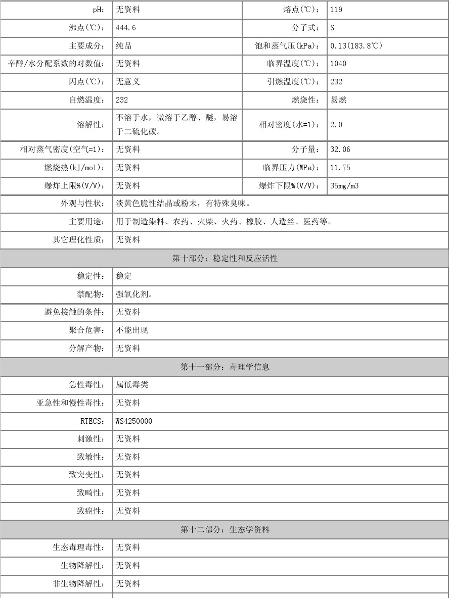 物化性質(zhì):性狀 粉狀硫黃為淡黃色粉末。熔點(diǎn)112.8℃沸點(diǎn)444.6℃相對(duì)密度2.07溶解性 易溶于二硫化碳,不溶于水,略溶于乙醇和醚類。